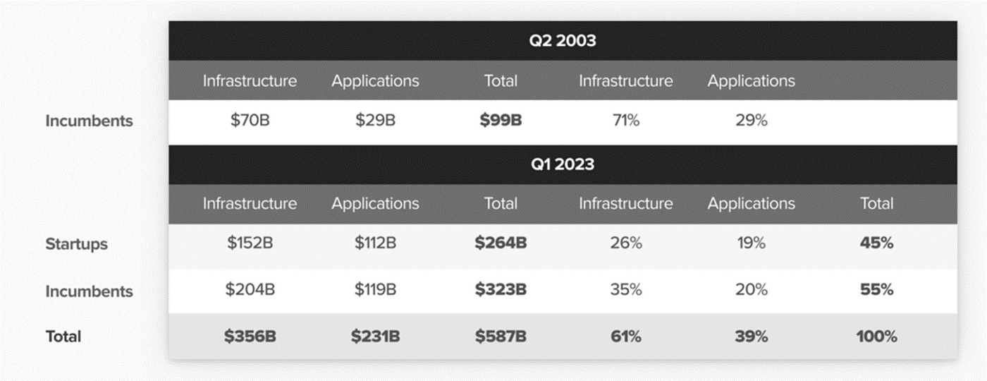 In 2003, the Infra/Cloud mix started at 70/30, and in 2 decades in 2023, it shifted to 60/40. During this time startups could capture roughly 50% of application dollars but only 40% of the infra dollars.